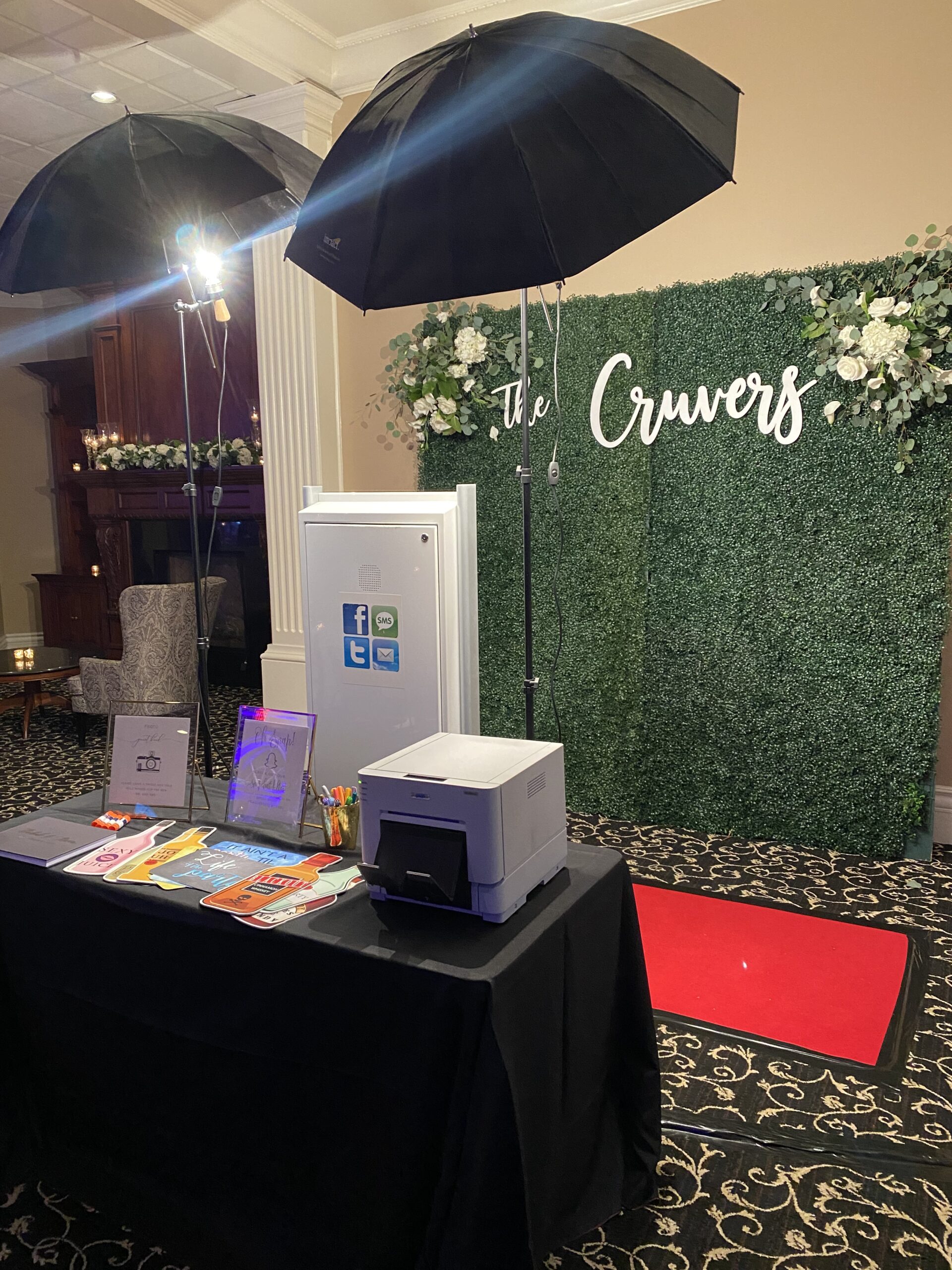 It includes a premium backdrop, red carpet setup, instant texting, and high-quality prints.